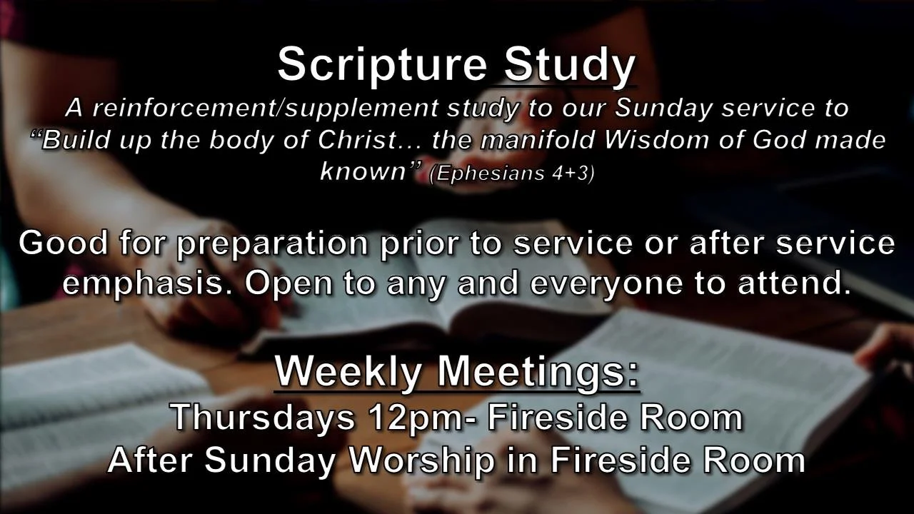 …meets in the Fireside Room off the Fellowship Hall one Saturday per month at 9:00am. Come enjoy community and study with one another. Email cindysteinbeck@yahoo.com for more details on the current series.
